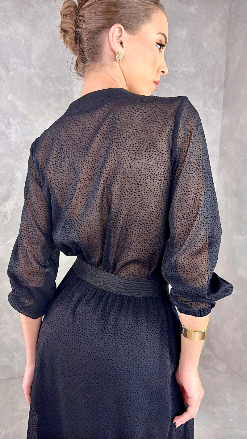 - Tecido Delicado: Confeccionada em chiffon maquinetado, a peça possui uma textura translúcida que enriquece o visual com feminilidade.