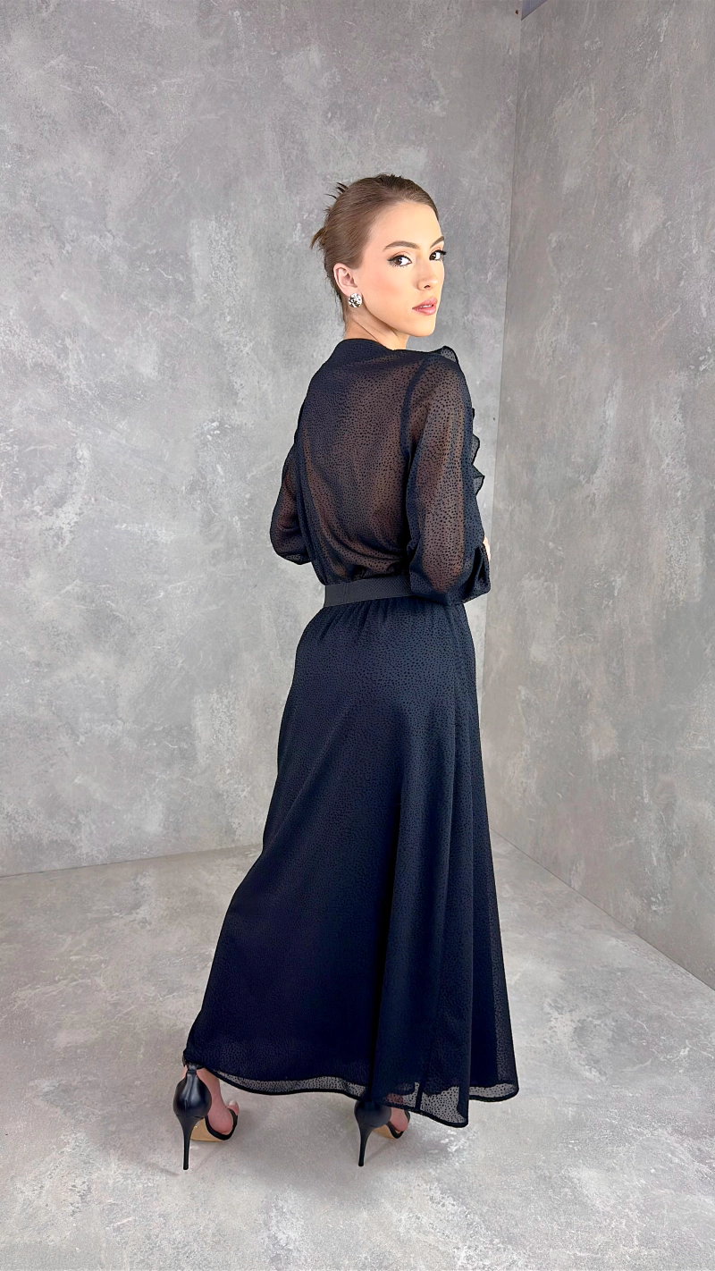 Descubra a Saia Midi Semi Godê, a peça que combina elegância e versatilidade em um único produto. Confeccionada em chiffon maquinetado, sua textura leve e sofisticada é ideal para qualquer ocasião.